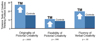 <명상을 한 그룹과 아무것도 안한 대조그룹 비교. 5개월 후 시험에서 초월 명상 그룹은 독창성과 유연성과 언어적 유창성에 대해 상당히 높은 점수를 받았다.>
