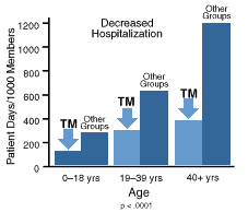<5년 동안 초월 명상 프로그램을 실천하는 2,000명 이상의 사람들을 대상으로 한 건강보험 통계에 대한 연구는 초월 명상 중재자들이 나이, 성별, 직업, 보험 조건이 비슷한 다른 그룹보다 일관되게 입원비의 절반도 되지 않는다는 것을 발견했다. 초월적 명상과 비 초월적 명상 집단의 차이는 노년층 대괄호에서 증가했다. 또 초월명상 중재자들은 심장질환 입원 87%, 암 입원 55% 등 17개 진료 항목에서 질병 발생 사례가 적었다.>