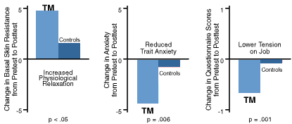 <포춘지 선정 100대 제조회사와 소규모 유통판매회사에서 정기적으로 초월명상 기법을 실천한 관리자와 직원들을 대상으로 실시한 이번 3개월간의 연구에서는 초월명상 실시자들이 보다 완화된 생리적 기능, 불안감 감소, 긴장감 감소 등을 보였다.>